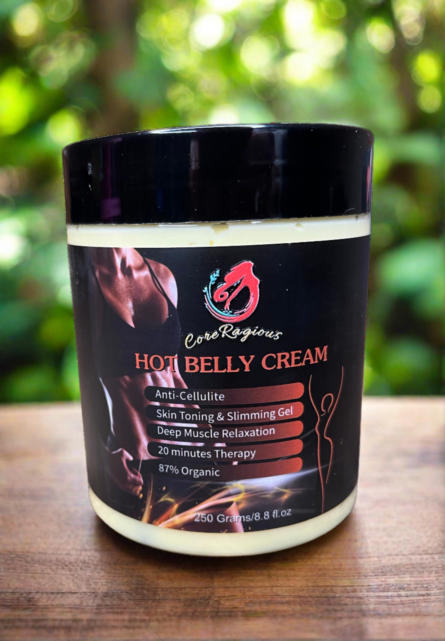 CoreRagious Hot Belly Cream, the only skin defining cream you will ever need! Indulge in our skin tightening and toning cream, your secret weapon for firmer, smoother skin. Enriched with nourishing ingredients, this luxurious cream deeply hydrates, improves elasticity and reduces the appearance of cellulite. Reveal a youthful sculpted silhouette with every application.